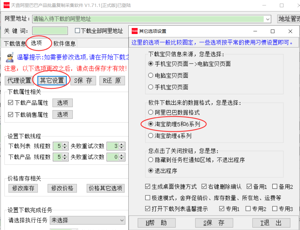 —>修改数据包保存格式,改成淘宝助理格式,选项—>其它设置—>淘宝助理5和6系列