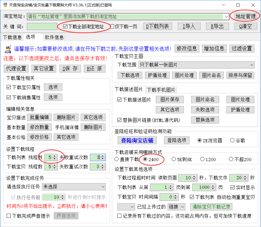 ▼软件最上方勾选下载全部淘宝地址,选项建议开到5线程,右下角下载店铺改成2400,打开地址管理;
