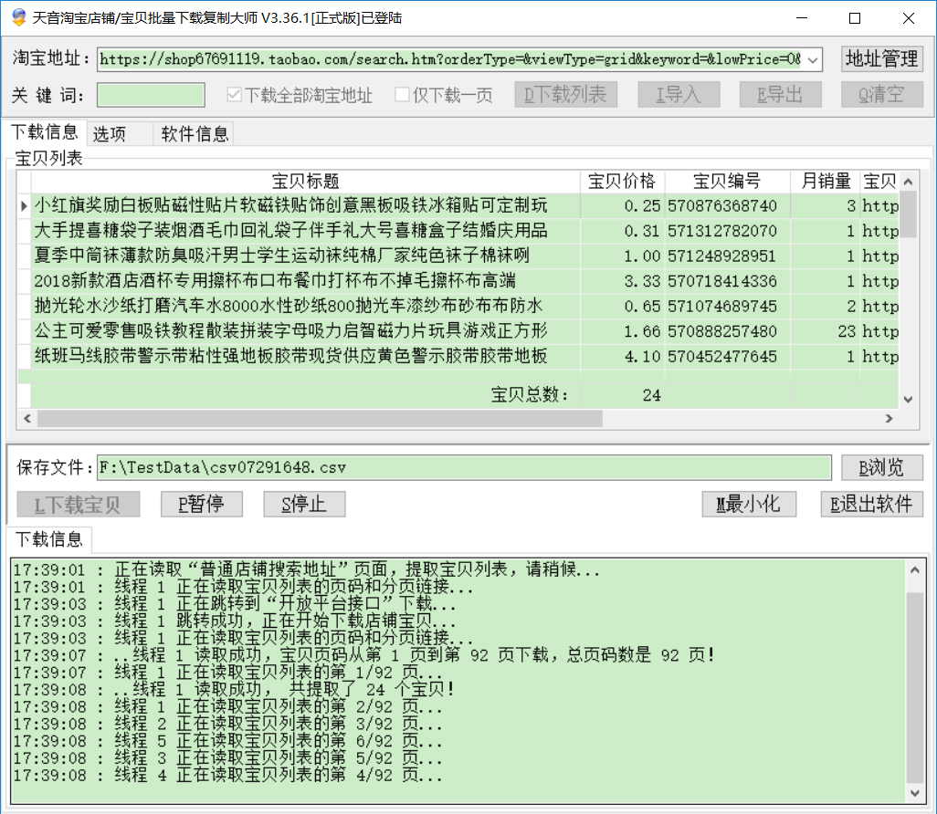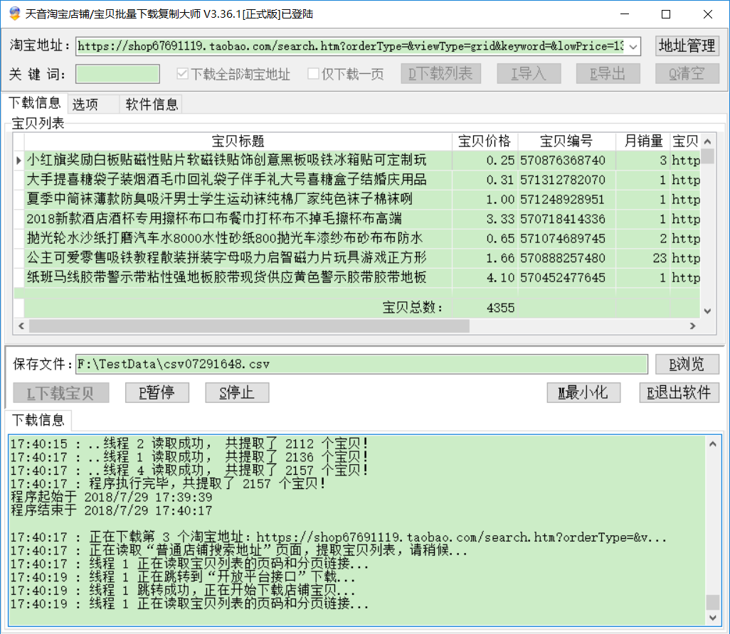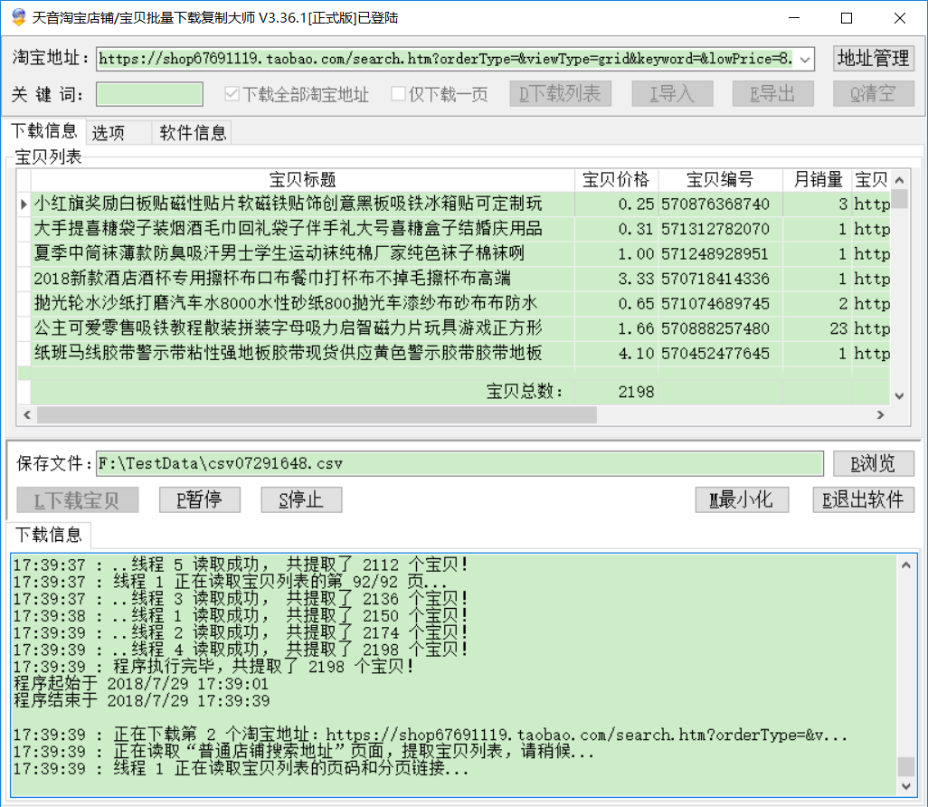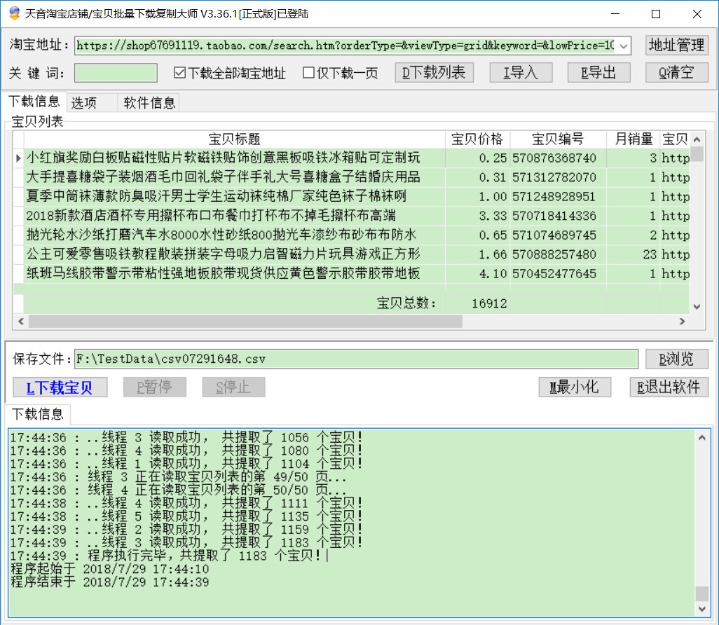 从17:39开始下载,到17:44:39结束,5分钟的时间即可下载1.6万的数据,全部的宝贝都没有重复
