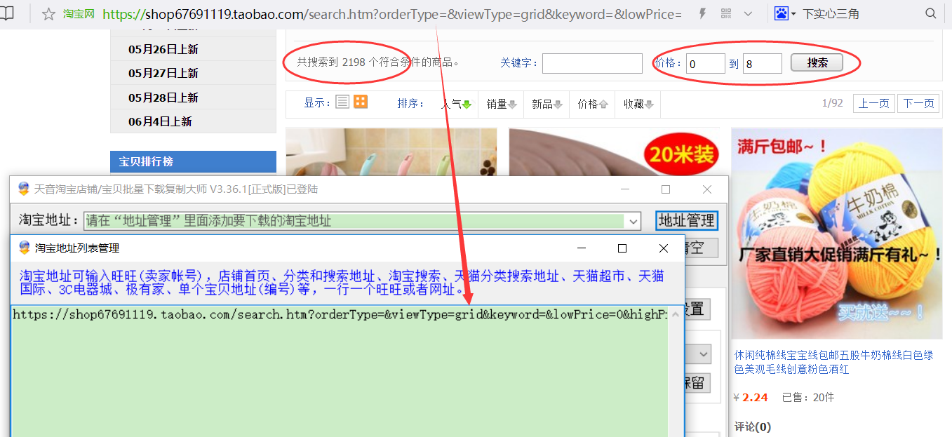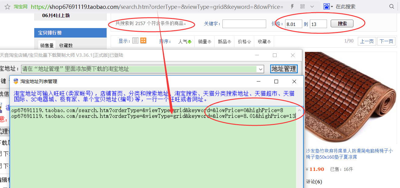 ▼按价格分区取链接,设定合适的价格区间,店铺内搜索到的宝贝数量接近2400,不得超过2400,挑选出来的多个链接一起放入地址管理,一行一个链接;