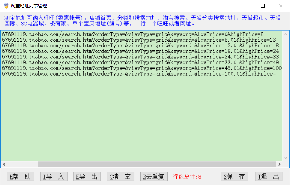 继续往下找链接,从8.01开始(价格精确到0.01,不能从9开始,这样会漏掉很多宝贝),8.01到15有3000多宝贝,我们把范围缩小,最终测试8.01到13有2100多个宝贝,继续把链接放入地址管理