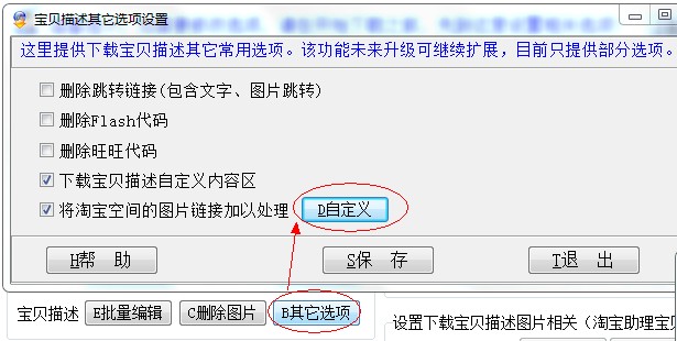 特别说明:如果需要对全部描述图片选择这种方式处理,请关闭“下载宝贝描述图片”,再选择该功能,因为软件优先下载图片,对剩下未下载的图片才会进行链接处理。