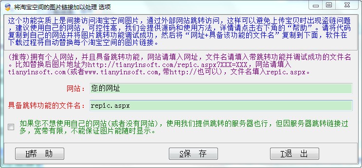 比如替换后图片地址为/repic.aspx?XXX=XXX,网站请填入tianyinsoft.com(或者www.tianyinsoft.com,带http://也可以),文件名填入repic.aspx。