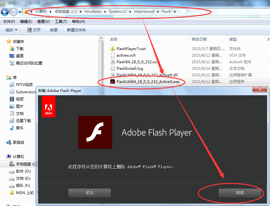 2、通过卸载Flash程序也可以解决这个问题:Flash一般会安装在“C:\WINDOWS\system32\Macromed\Flash”,点开这个目录,里面有个卸载程序,双击直接卸载就可以了。