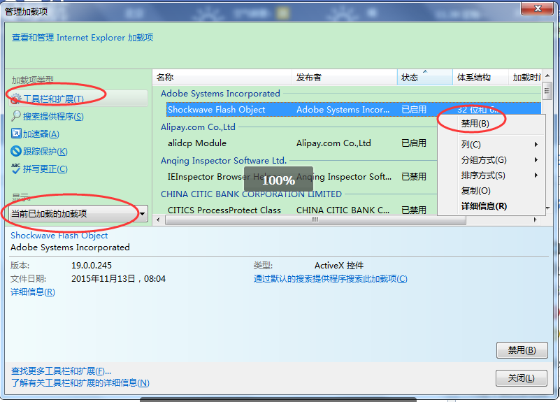 找到Flash的加载项,然后点右键把它禁用就可以了