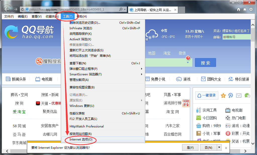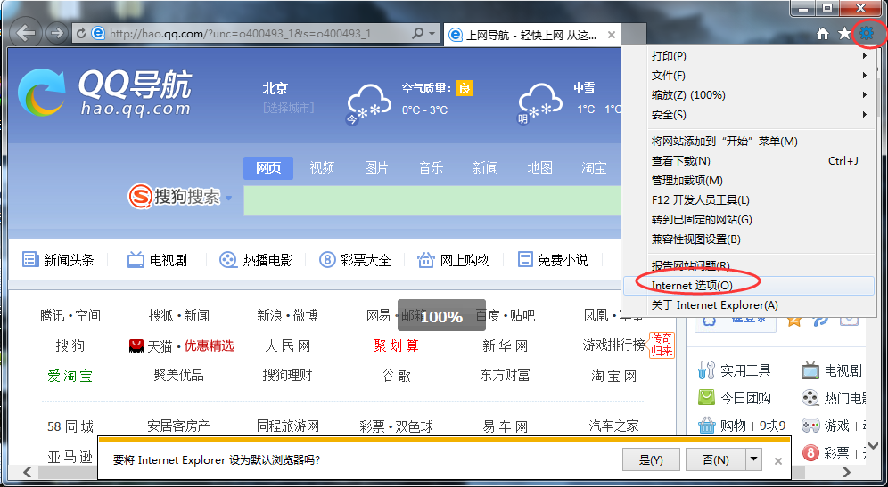 打开IE后,找到Internet选项