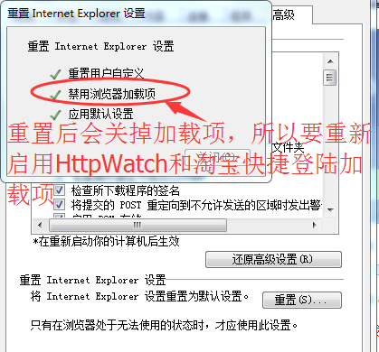 如何重置浏览器以及重置后启用HttpWatch和淘宝自动登陆功能(有声视频演示):