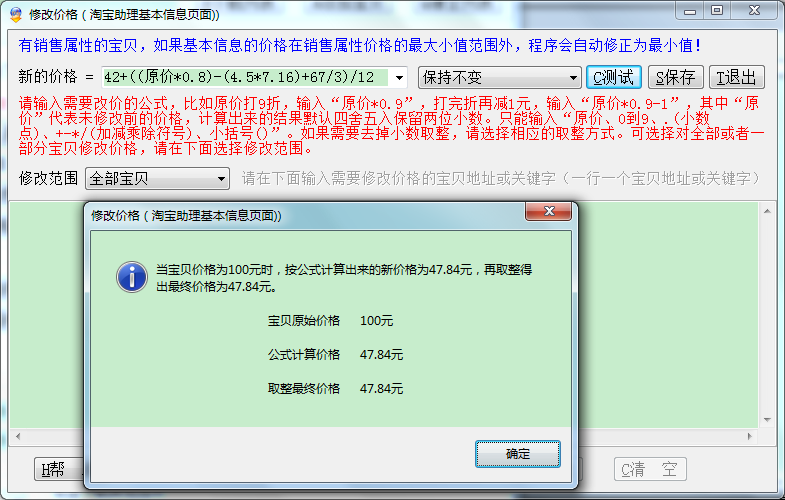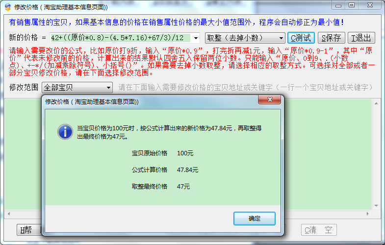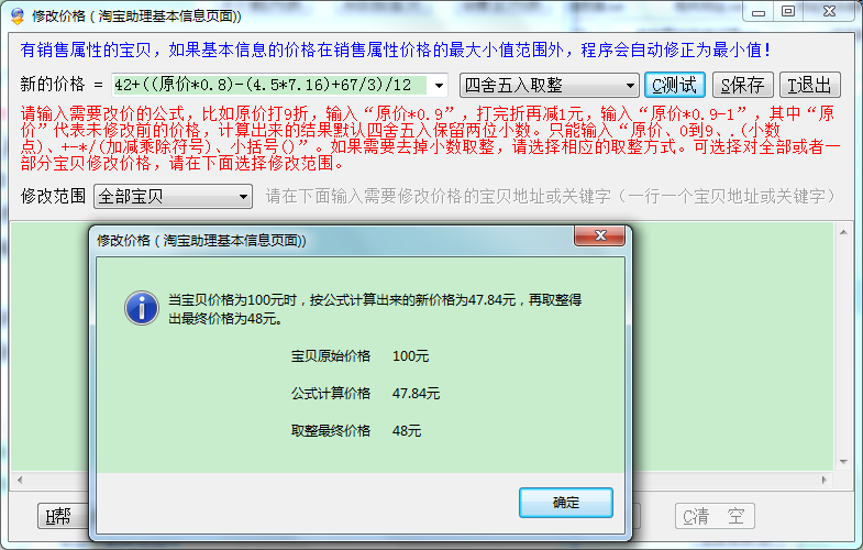 ▲复杂修改价格:如下修改价格公式 42+((原价*0.8)-(4.5*7.16)+67/3)/12,修改后四舍五入取整
