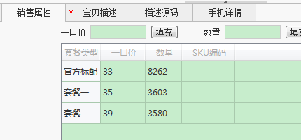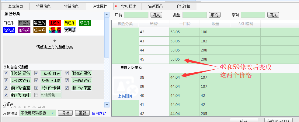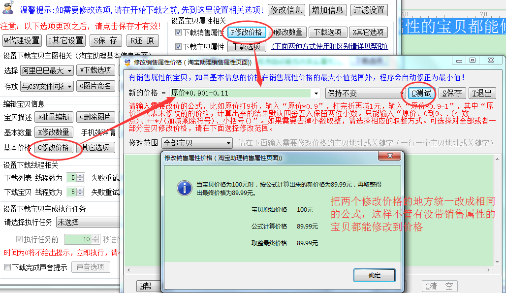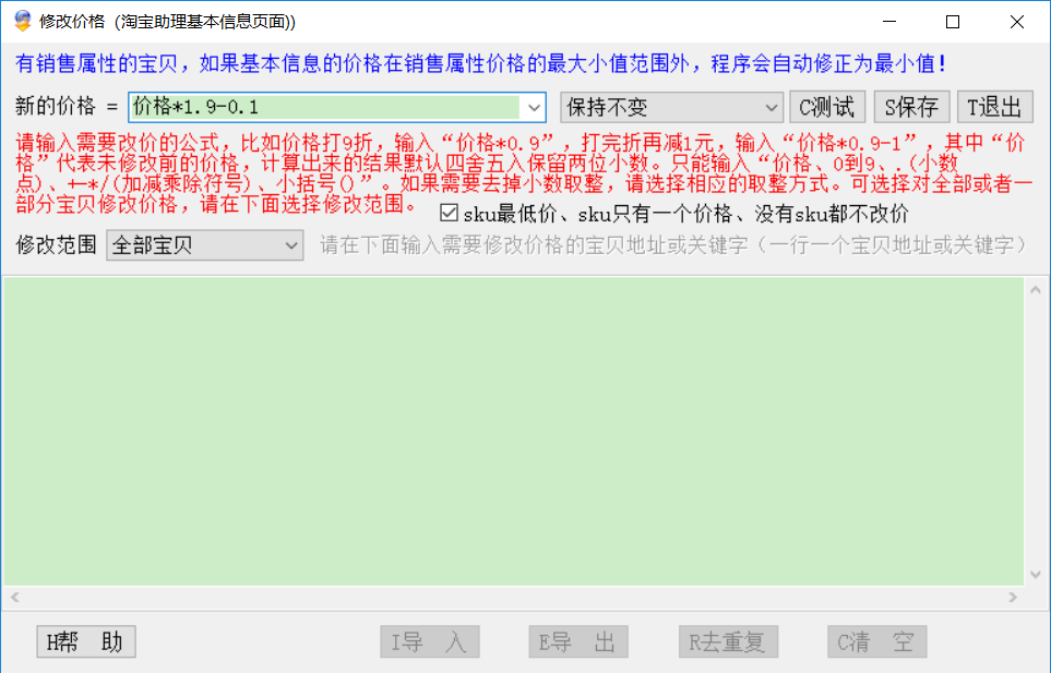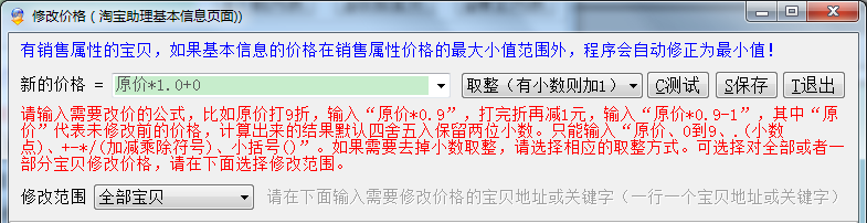 修改价格说明:有销售属性的宝贝,如果基本信息的价格在销售属性价格的最大小值范围外,程序会自动修正为最小值!