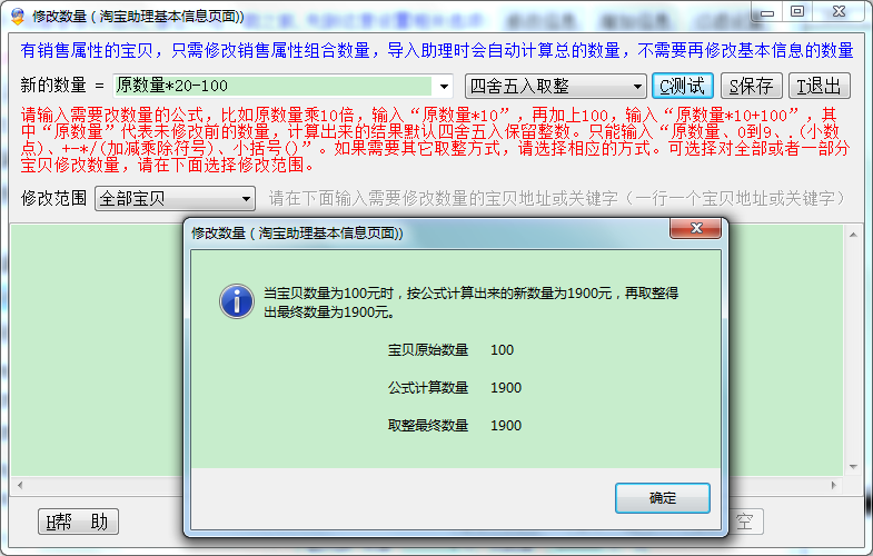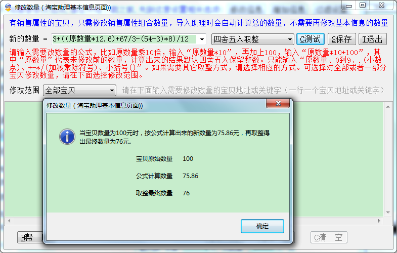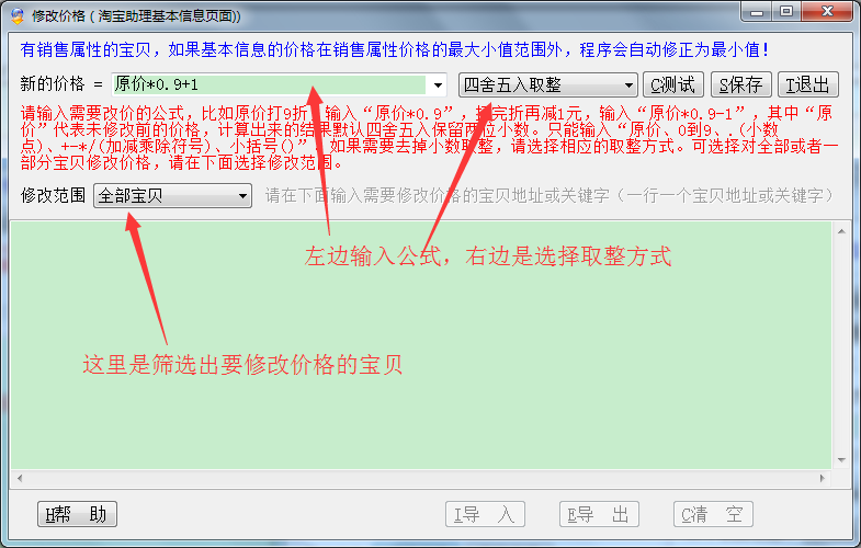 公式输入要求:请输入需要改价的公式,比如原价打9折,输入“原价*0.9”,打完折再减1元,输入“原价*0.9-1”,其中“原价”代表未修改前的价格,计算出来的结果默认四舍五入保留两位小数。只能输入“原价、0到9、.(小数点)、+-*/(加减乘除符号)、小括号()”。如果需要去掉小数取整,请选择相应的取整方式。可选择对全部或者一部分宝贝修改价格,请在下面选择修改范围。