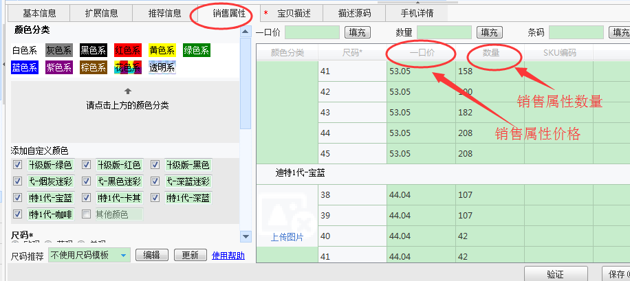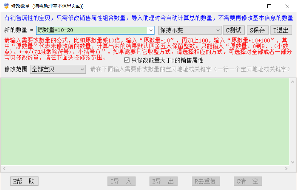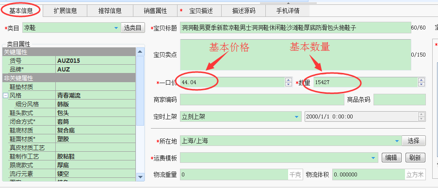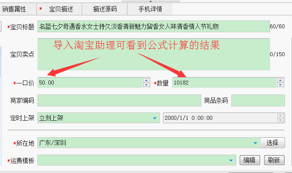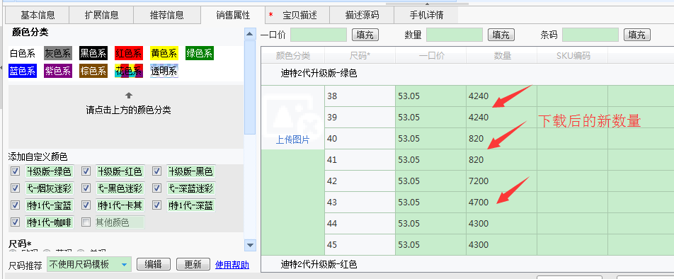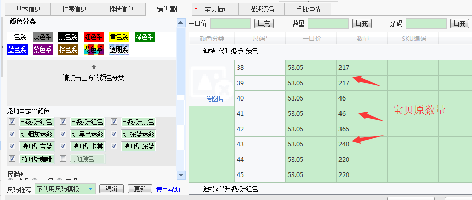 修改数量说明:有销售属性的宝贝,只需修改销售属性组合数量,导入助理时会自动计算总的数量,不需要再修改基本信息的数量!