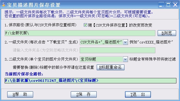 可以选择宝贝描述图片下载之后保存哪里,默认与CSV文件保存位置相同,名称为“csvXXXX_描述图片\<宝贝标题>”。