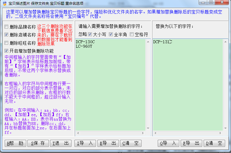 这里可以增加替换删除宝贝标题的一些字符,缩短和优化文件夹的名字。如果增加替换删除后的宝贝标题变成空的,二级文件夹名称将会使用“宝贝编号”代替,详细使用请看下宝贝标题增加替换删除功能