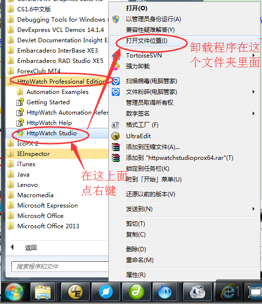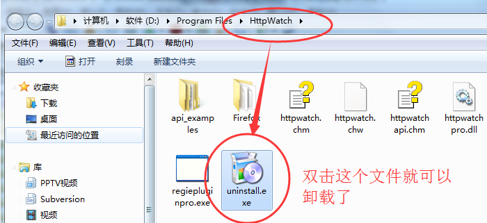 从系统里面已经安装的程序查找—>找到HttpWatch的程序目录—>Uninstall就是卸载程序。