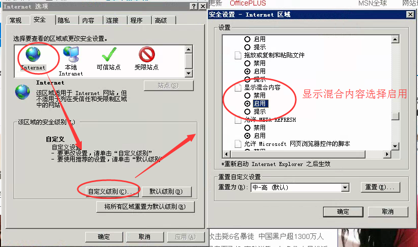 这个问题完整的解决办法:打开IE系统浏览器—>打开Internet选项—>安全—>Internet—>自定义级别—>把“显示混合内容”改为启用,再点确定就可以了。