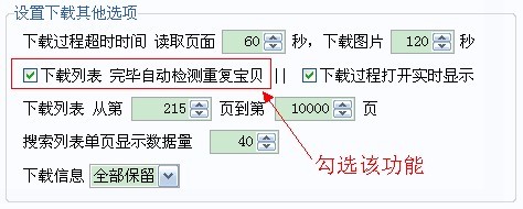 将“自动检测重复宝贝”功能关闭,“下载列表”从第200页开始下载。