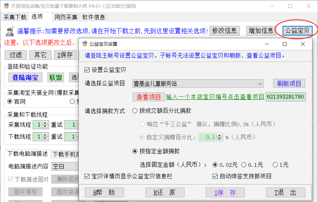 天音淘宝数据包制作 设置公益宝贝