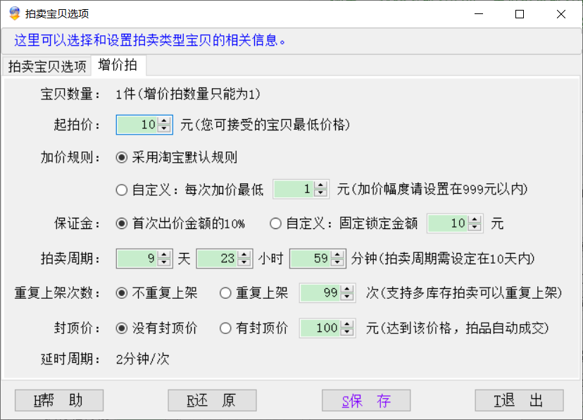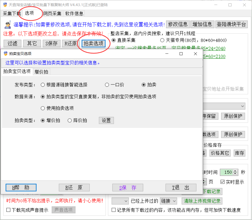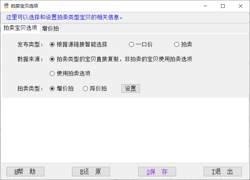 拍卖——>不管源链接是一口价还是拍卖,下载宝贝都是拍卖;一口价转成拍卖,将会使用拍卖选项。