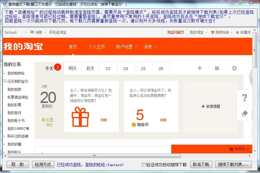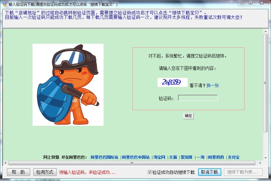 3、输入店铺地址点下载列表,下载过程“登陆窗口”和“验证码窗口”会交替出现,正常来说,“登陆成功”或者“验证码输入点确定”之后,都可以自动继续下载,每次登陆(验证)成功后至少可以连续成功下载几页。