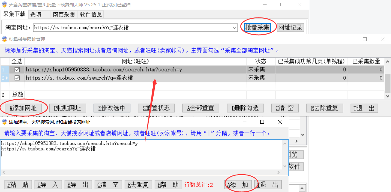 —>第二步:点击批量采集—>添加网址,输入要采集的网址(淘宝网址可供下载的类型),点击添加