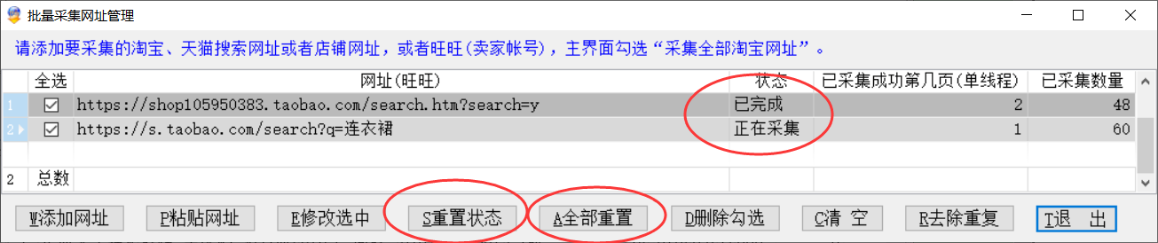 需要重新采集,可以将所有网址重置到“未采集”状态,再去点击“开始采集”