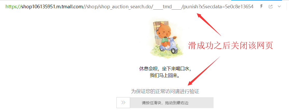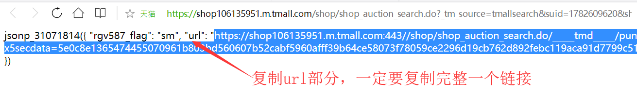 —>第一步:点击“店铺搜索”,如果页面显示出"url":"",请复制这个链接的内容到另一个页面打开,滑块成功后回到该页面;如果页面显示的是数据,可直接跳过这一步