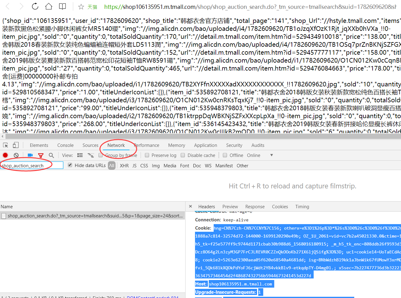 —>第二步:刷新一次页面,显示出数据,Filter框输入【shop_auction_search】,选中记录,右边Headers拉下来,在Request Headers里面找到cookie,选中cookie的整段内容右键复制,然后到当前窗口点击“粘贴继续”;