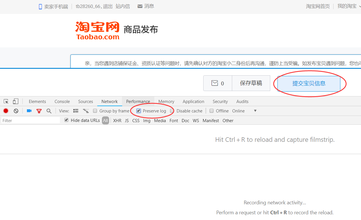 —>第三步:按F12打开“开发者工具”,点击Network,【勾选Preserver log】,网页最下面点击“提交宝贝信息”