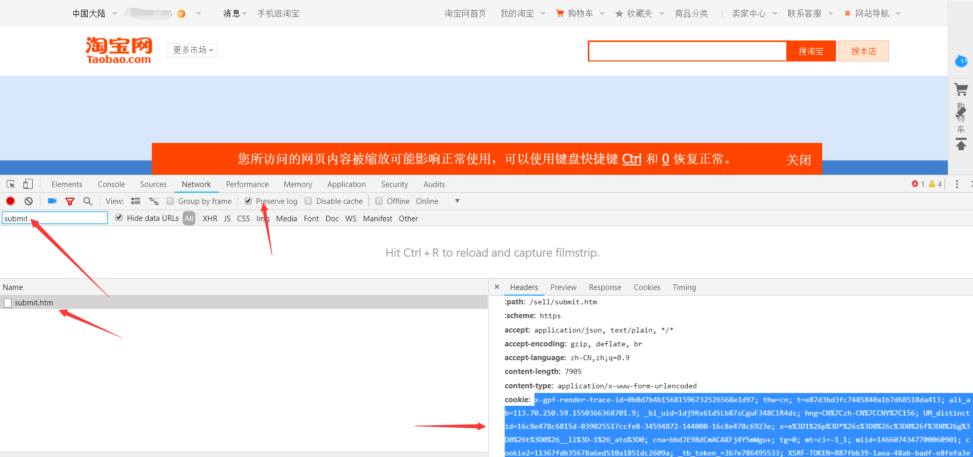 —>第四步:Filter框输入【submit】,找到submit.htm,选中,右边Headers拉下来,在Request Headers里面找到cookie,选中cookie的整段内容右键复制