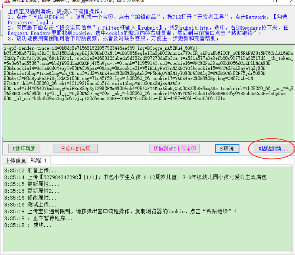 正常上传宝贝,出现滑块限制,软件暂停,并弹出更换cookie窗口;