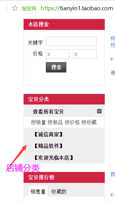 ▼店铺分类在店铺首页的左侧可以看到,在店铺后台—>店铺管理—>宝贝分类管理 里面可以添加