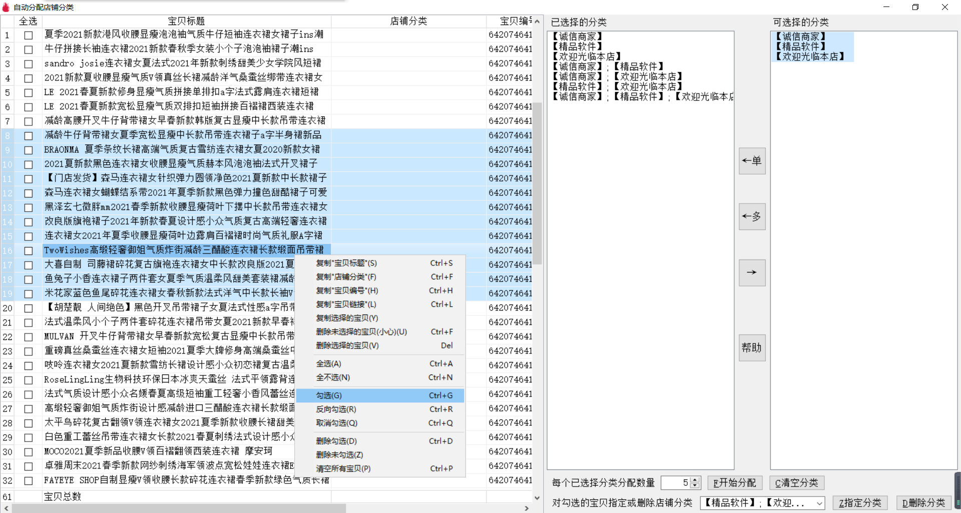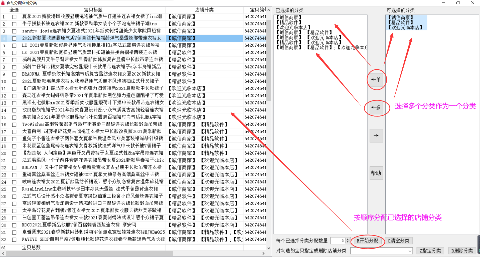 ▼这个功能可以按顺序分配已选择的店铺分类,分类可以是单个,或者是多个分类作为一个分类。