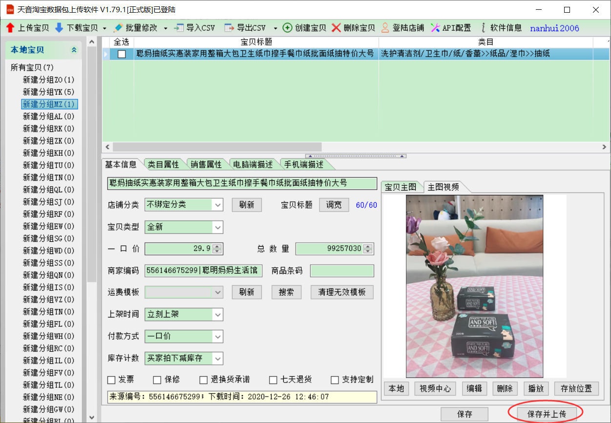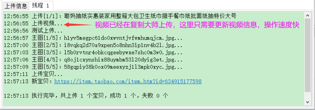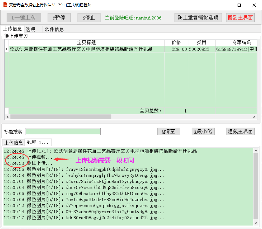 ▼点左上角一键上传,或者是右下角保存上传当前的宝贝,可以看到上传本地视频需要一段时间