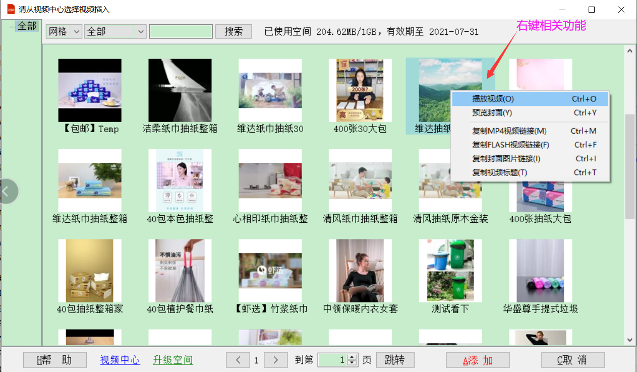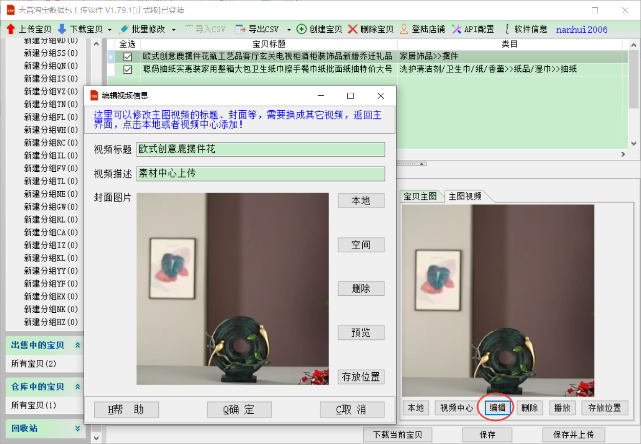 主图视频功能包括添加、修改和删除视频等。 搭配淘宝数据包制作使用,可以直接复制上家的视频,也可以选择店铺已有的视频。