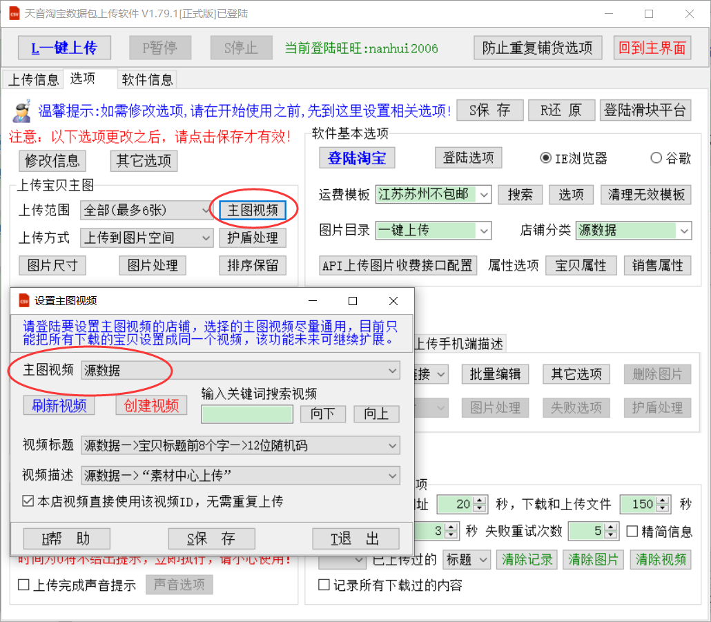 ▼上传窗口选项左上角有一个主图视频功能,默认使用源数据,也可以选择某个固定视频,这样上传的宝贝可以统一视频