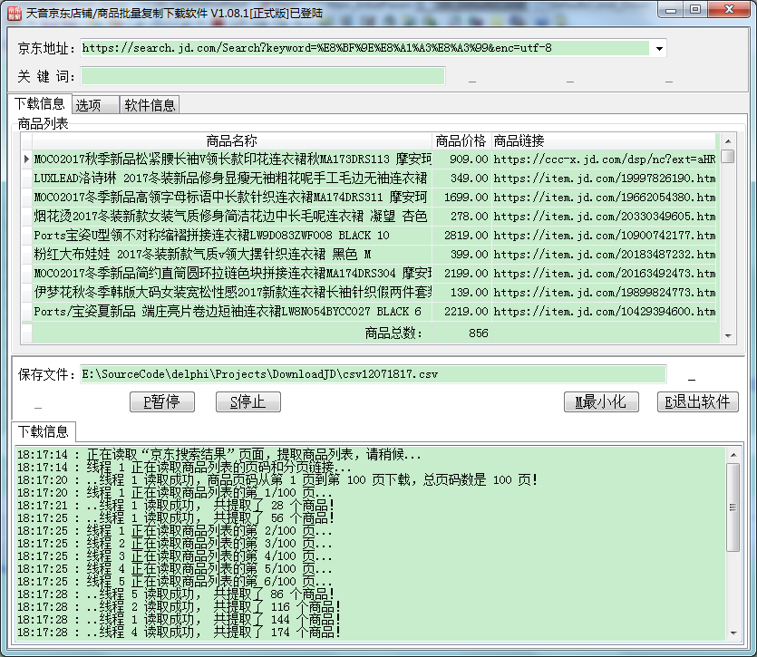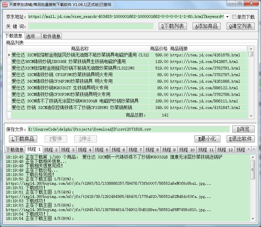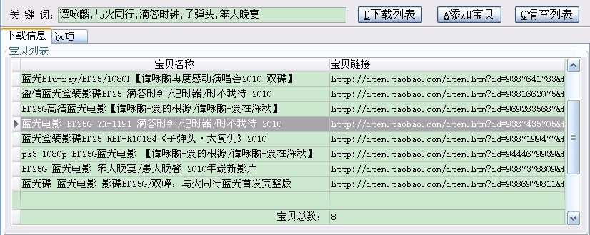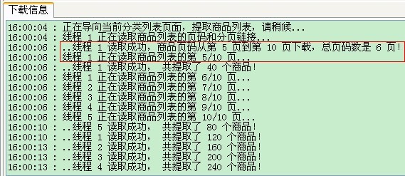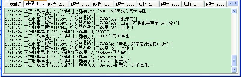 下载列表和下载商品这两个过程都使用多线程抢占方式,即先完成的线程继续下载下一页(个),加快下载速度,点击相应的线程页面可查看下载的情况。另外,“选项”里面可以设置下载的线程数、重试次数、超时时间。