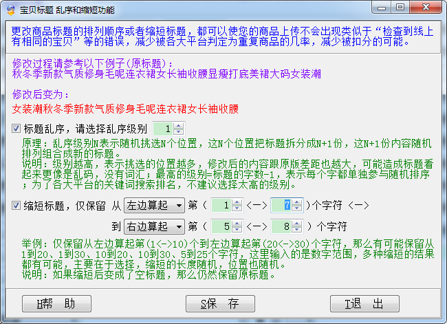 说明:级别越高,表示挑选的位置越多,修改后的内容跟原版差距也越大,可能造成标题看起来更像是乱码,没有词汇;最高的级别=标题的字数-1,表示每个字都单独参与随机排序;为了各大平台的关键词搜索排名,不建议选择太高的级别。