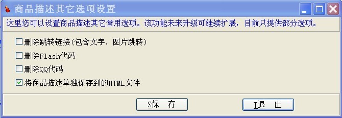 删除跳转链接(包含文字、图片跳转):如果下载的商品描述里面包含了很多链接,顾客浏览时点击将会跳转到原来的店铺,这样会影响正常库存,选上该项能将附在文字、图片上面的跳转链接通通去掉;