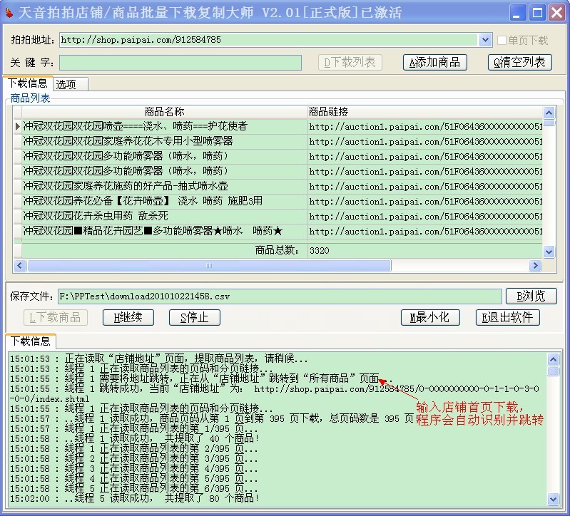 如果输入店铺首页地址,需要下载整个店铺,请把“单页下载”功能去掉,程序会自动识别并从“店铺地址”跳转到“所有商品”页面,下载整个店铺的商品!