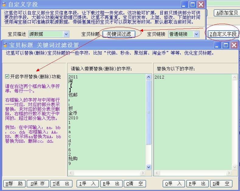 这个功能在“自定义字段”里面,这里可以替换(删除)商品标题的一些字符,比如“代销、秒杀、聚划算、淘金币”等等,优化商品标题。