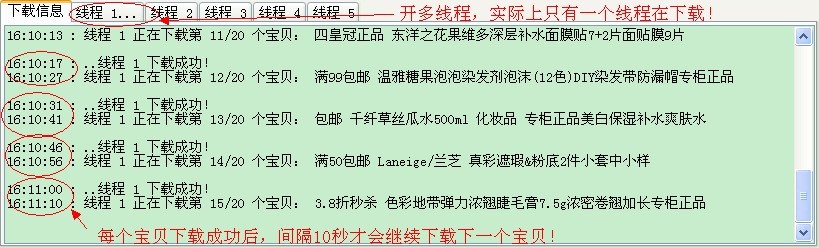 这个功能可以控制每个商品下载成功后,间隔一段时间再下载另一个商品。软件默认设为0秒,全速下载。开启之后(大于0秒),多线程功能实际上相当于单线程的效果,建议只开一个线程下载即可,这样无需其它线程一直等待,节省资源。