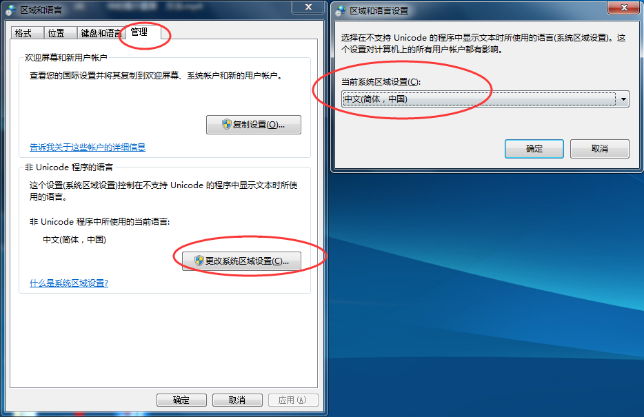 管理—>非Unicode程序的语言—>更改系统区域设置—>选择“中文(简体,中国)”;