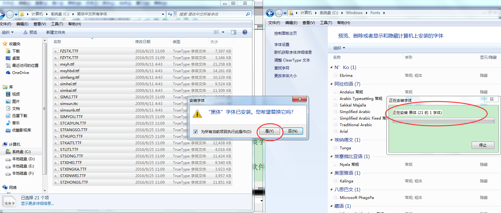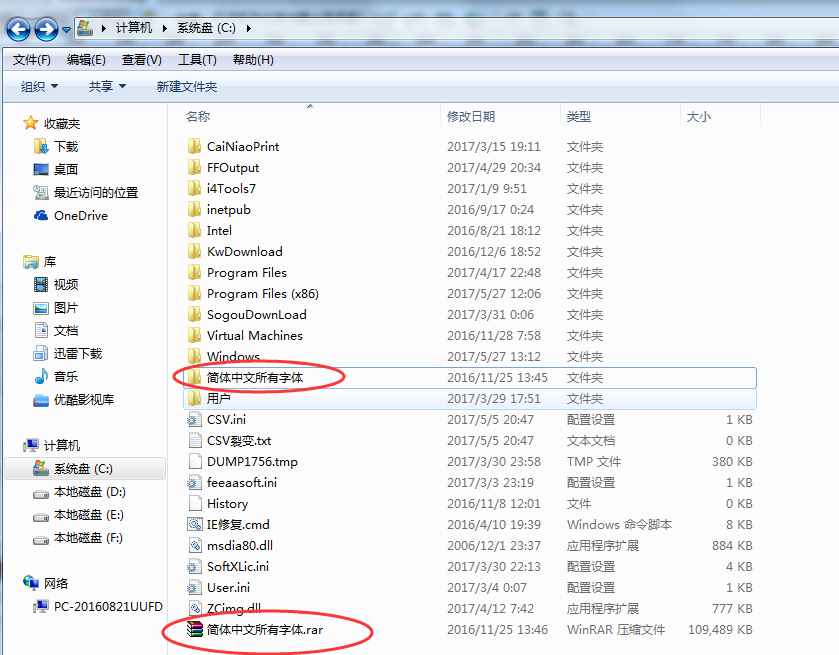 打开解压的文件夹,把所有字体拖到C:\Windows\Fonts里面就可以自动安装字体。