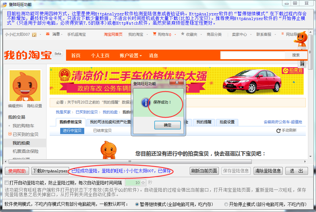 装好之后,记得重新打开天音宝贝下载软件,进入“选项(右下角)—>选择HttpAnalyzer—>登陆旺旺功能”,登陆一个旺旺试下,如果能像如下图显示,则表示HttpAnalyzer软件已经可以正常使用。