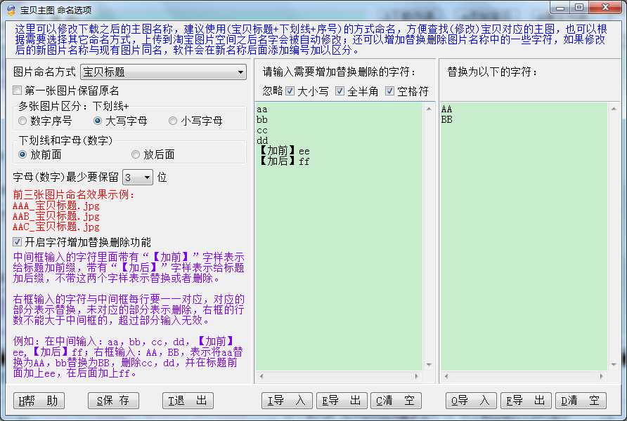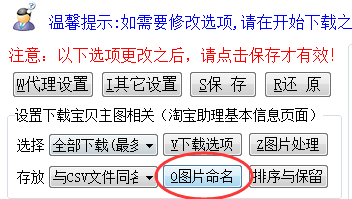 这里可以修改下载之后的主图名称,建议使用(宝贝标题+下划线+序号)的方式命名,方便查找(修改)宝贝对应的主图,也可以根据需要选择其它命名方式,上传到淘宝图片空间之后名字会被自动修改;还可以增加替换删除图片名称中的一些字符,如果修改后的新图片名称与现有图片同名,软件会在新名称后面添加编号加以区分。