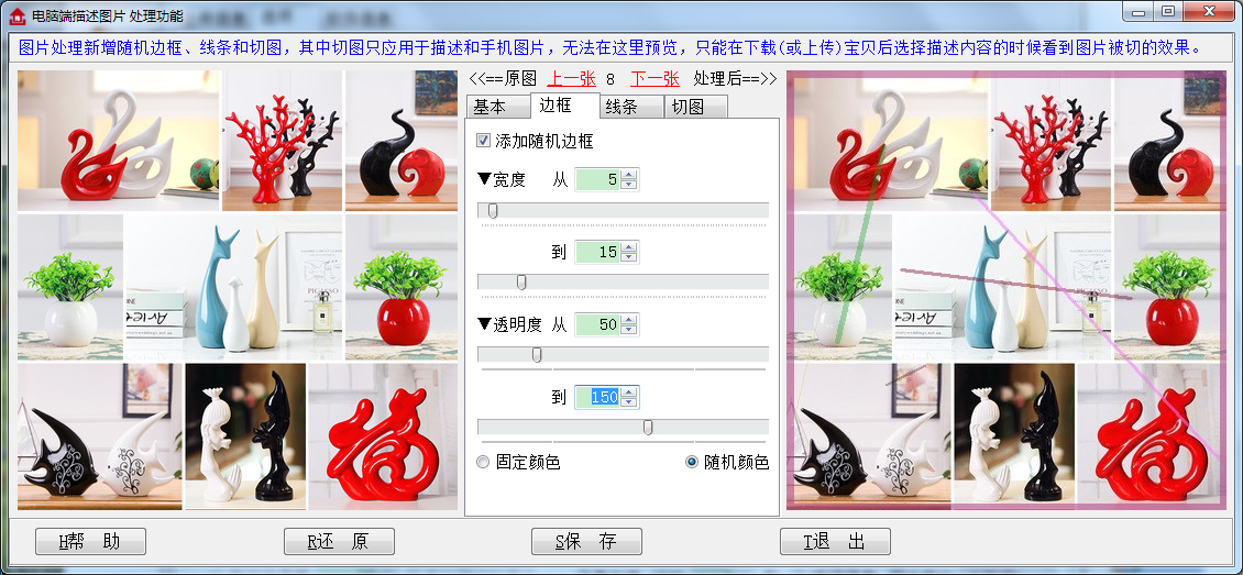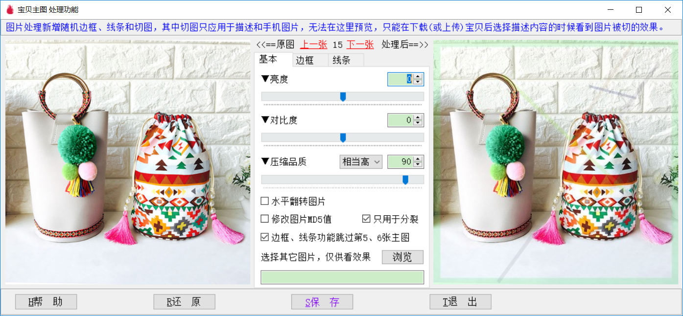 这里是处理图片的功能,可对主图、颜色图、描述和手机端图片分别处理,可对图片进行切图,添加随机边框、线条,调整亮度、对比度、压缩品质、水平翻转等,可防止出现实拍保护提示和违规扣分。