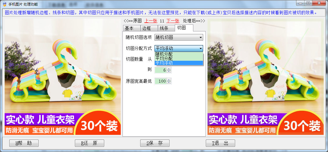 描述图片默认随机切图;手机图片由于淘宝对尺寸、大小等有严格限制,默认平均浮动;