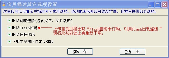 如果您没有订购淘宝Flash服务,下载的数据,宝贝描述里面带有Flash,上传时就会出现这个提示。可以在下载前打开 删除Flash代码 功能,这样下载的数据就不包含Flash代码。