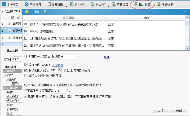 第二、利用淘宝助理的图片搬家功能先把图片上传到淘宝空间,然后再上传宝贝。