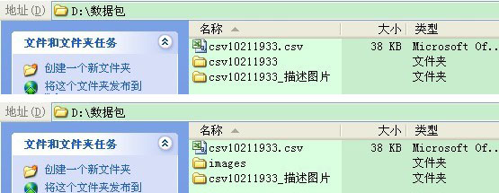 宝贝(销售属性)图片文件夹 可选择两种命名方式(“与CSV文件同名”或者“images”),如上图展示的都是正确的。如果您改动了这三者之间的任何一个,请特别注意一下它们之间的关系: